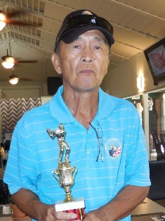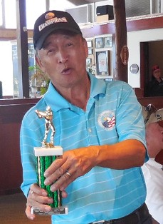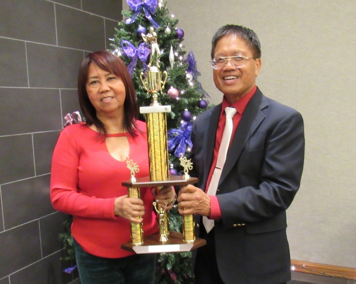 EAGLE Masters 2016 Champion, Greg Garcia, receiving his trophy from wife, Siony, during the EAGLES Awards Night at Kapolei Golf Club on December 18, 2016.